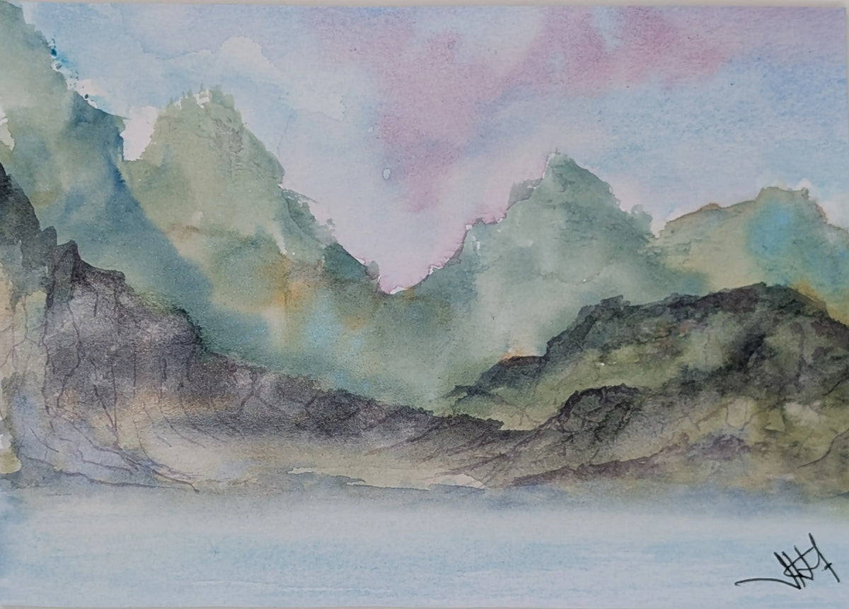 My landscape style draws inspiration from my favourite watercolourist, David Bellamy, and the beautiful, harmonious paintings of China's Master landscape painters. My dream is to one day visit China and paint its wondrous scenery. I enjoy painting from my imagination, drawing on memories from places I have visited, or embellishing the natural landscape to create something unique.