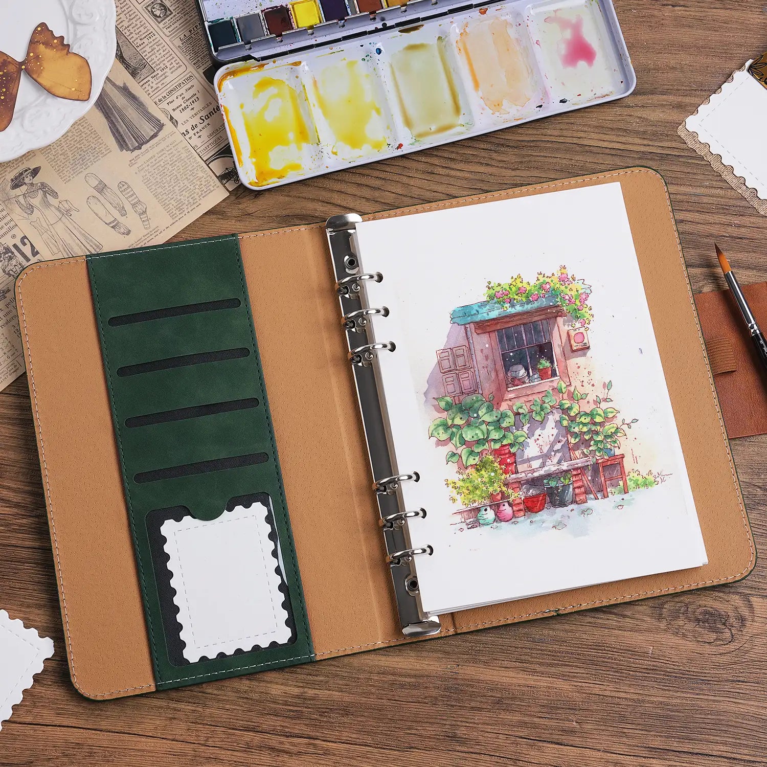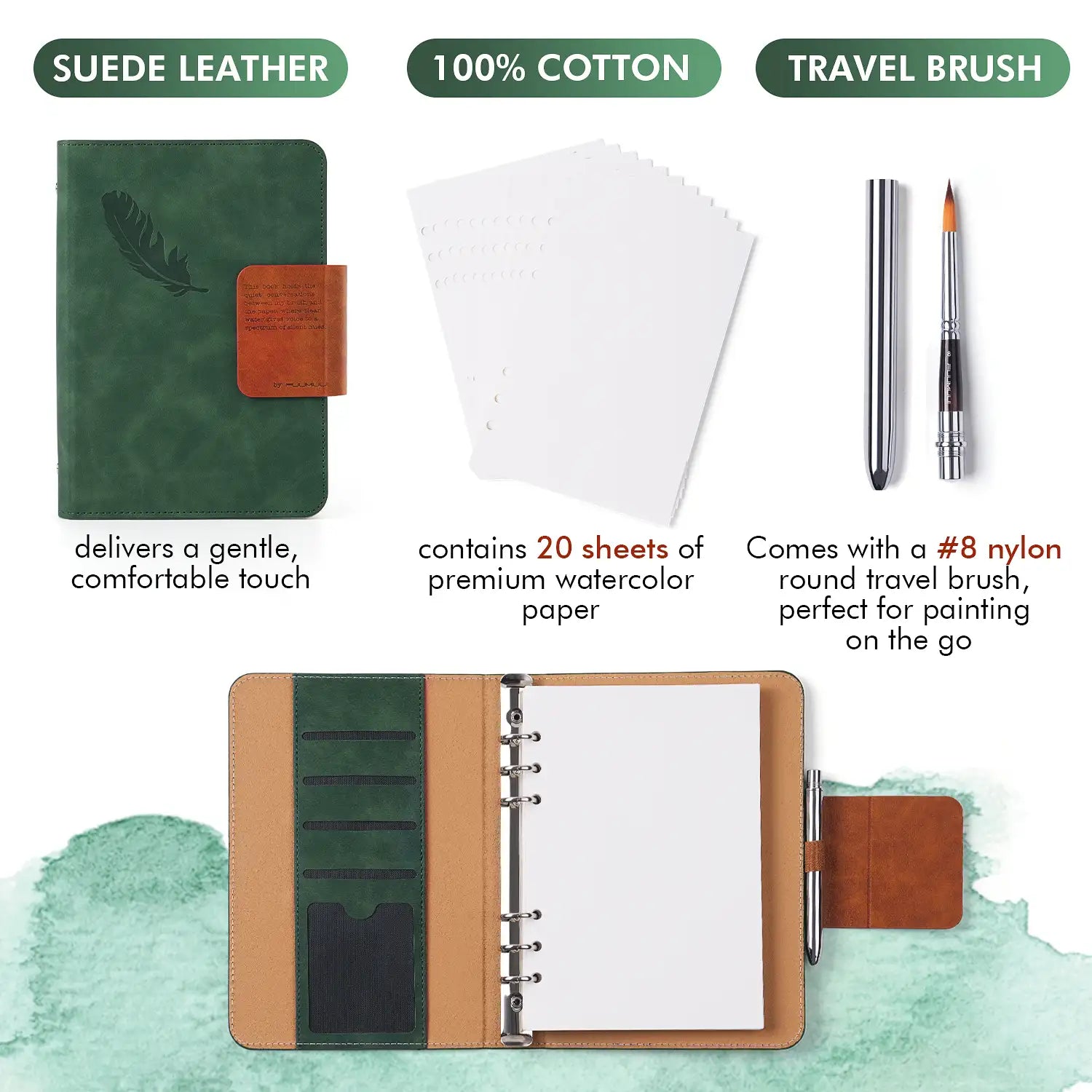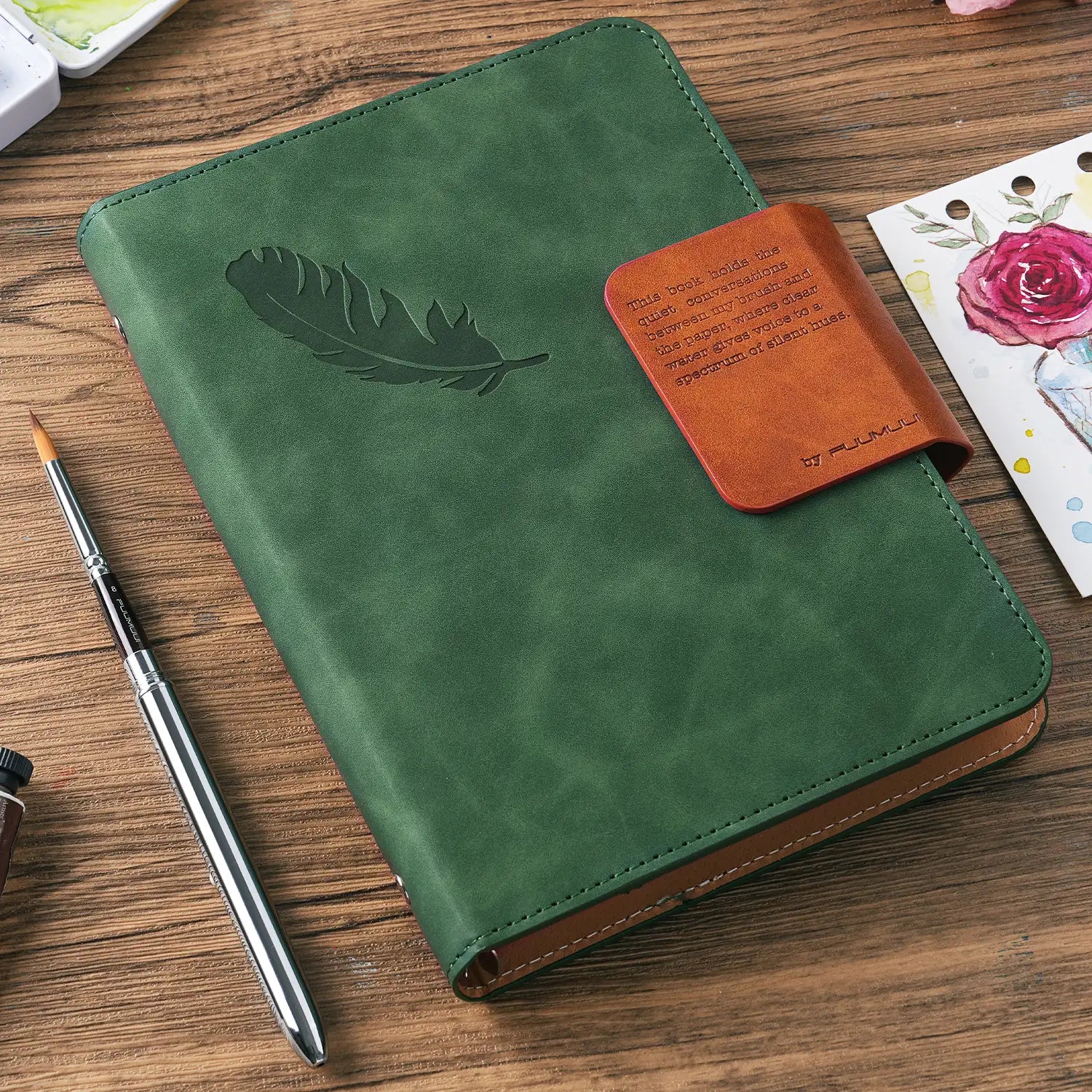 Fuumuui Suede Leather Watercolor Loose-Leaf Sketchbook with A Round Travel Brush