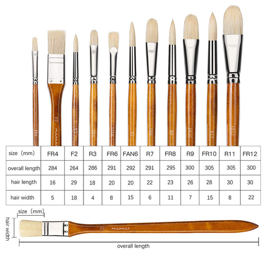 Oil painting brushes use natural (hog for texture/thick paint) or synthetic bristles. Hog bristles offer stiffness for impasto; synthetics provide smooth application, fine detail, and are easier for oil painting brush cleaning.