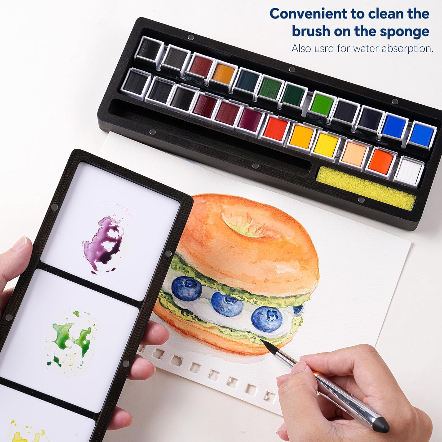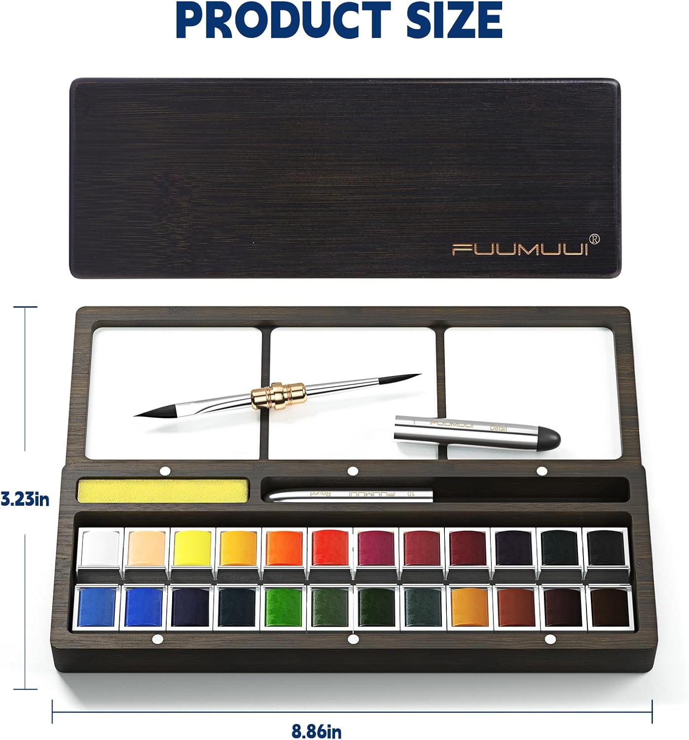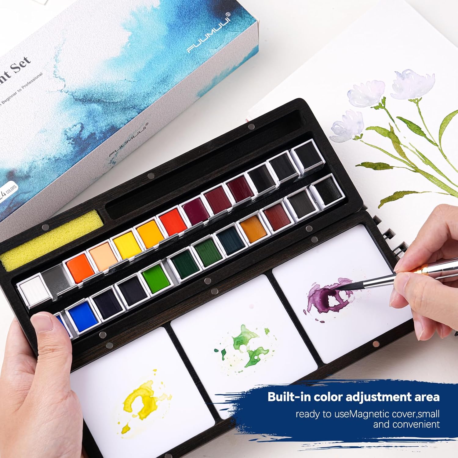 Fuumuui 24 Couleurs Peinture Aquarelle avec Pinceaux de Voyage à Double Pointe et Palette en Bois