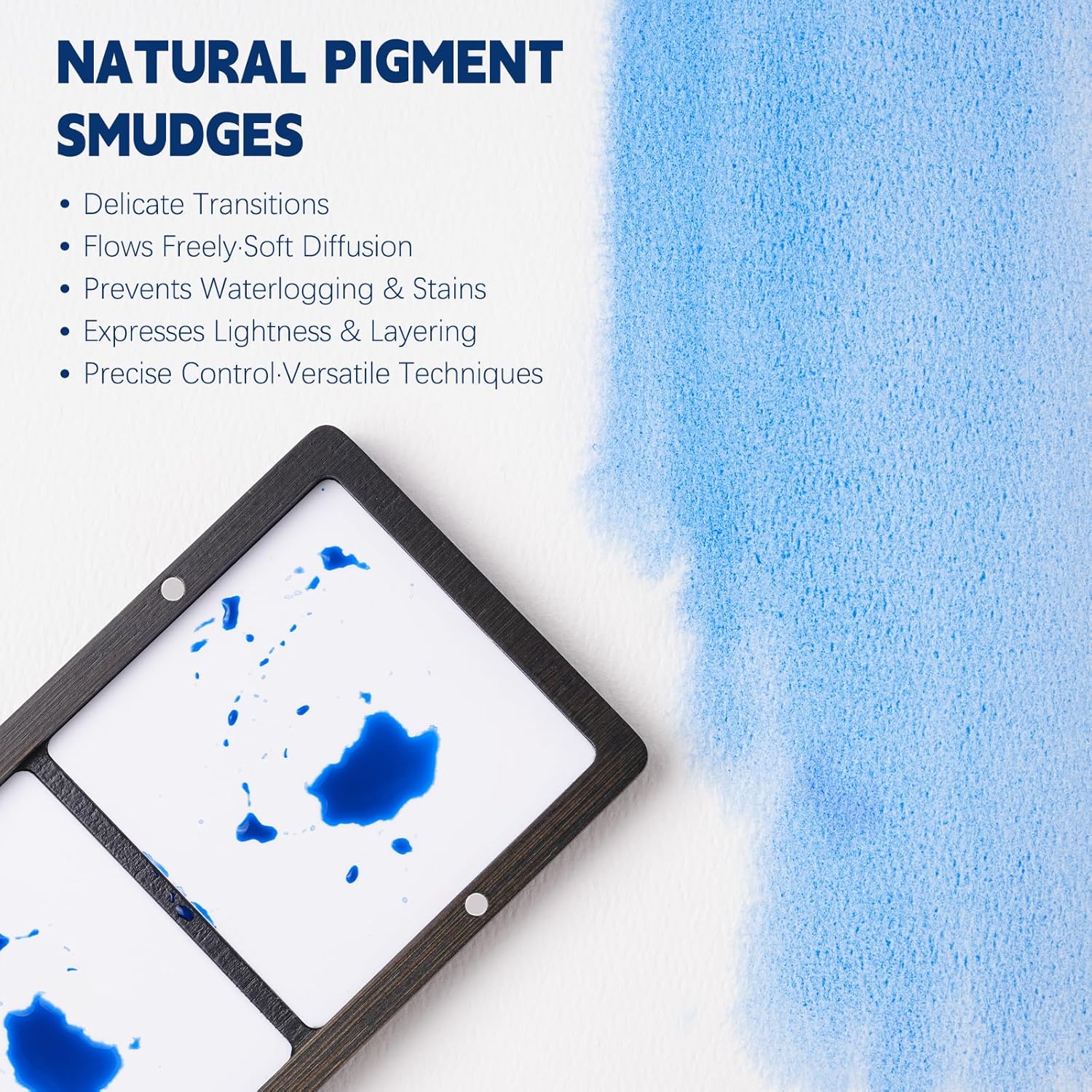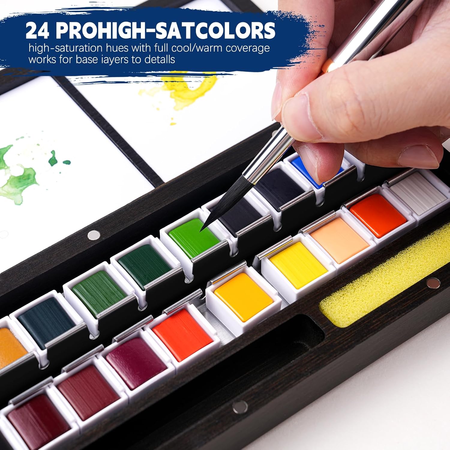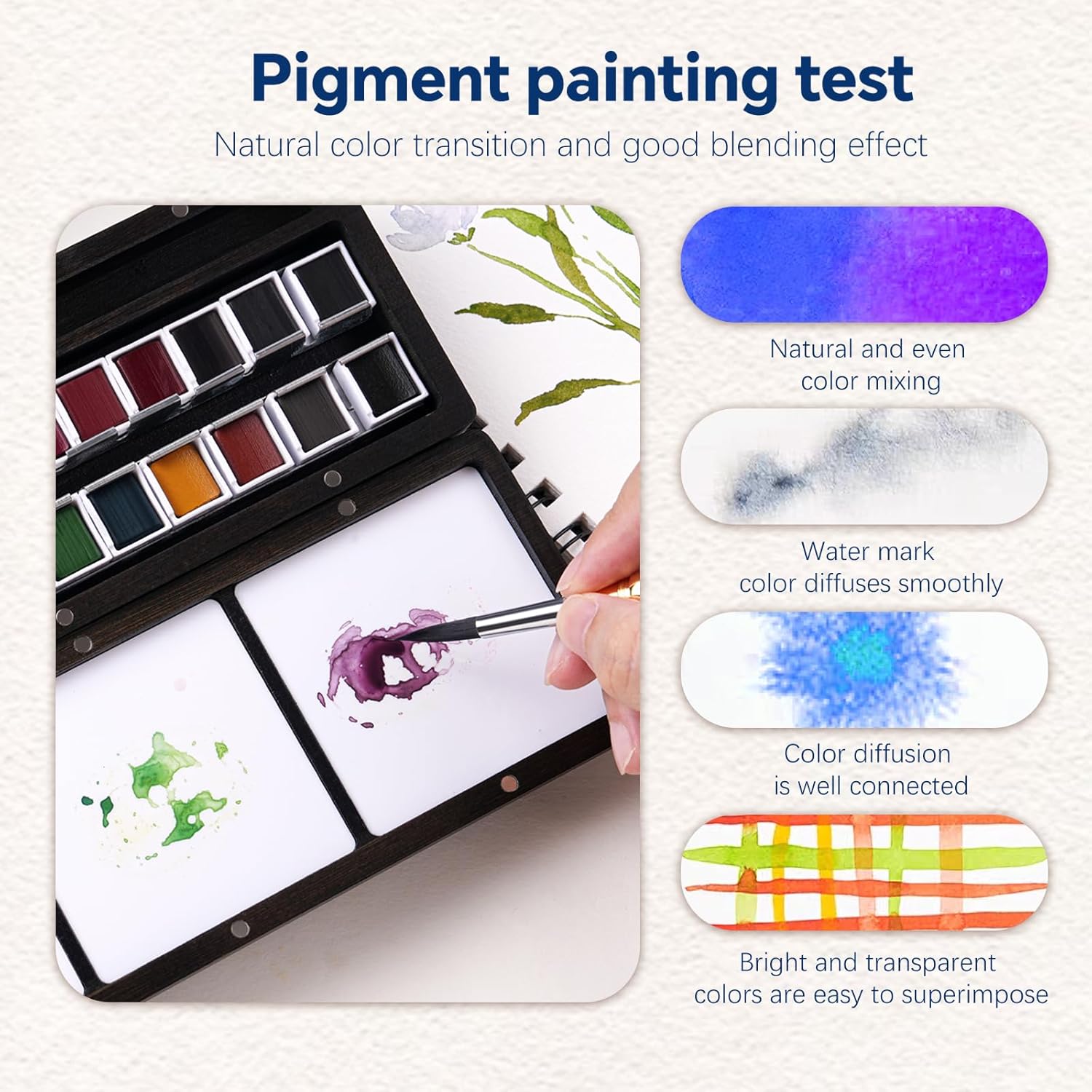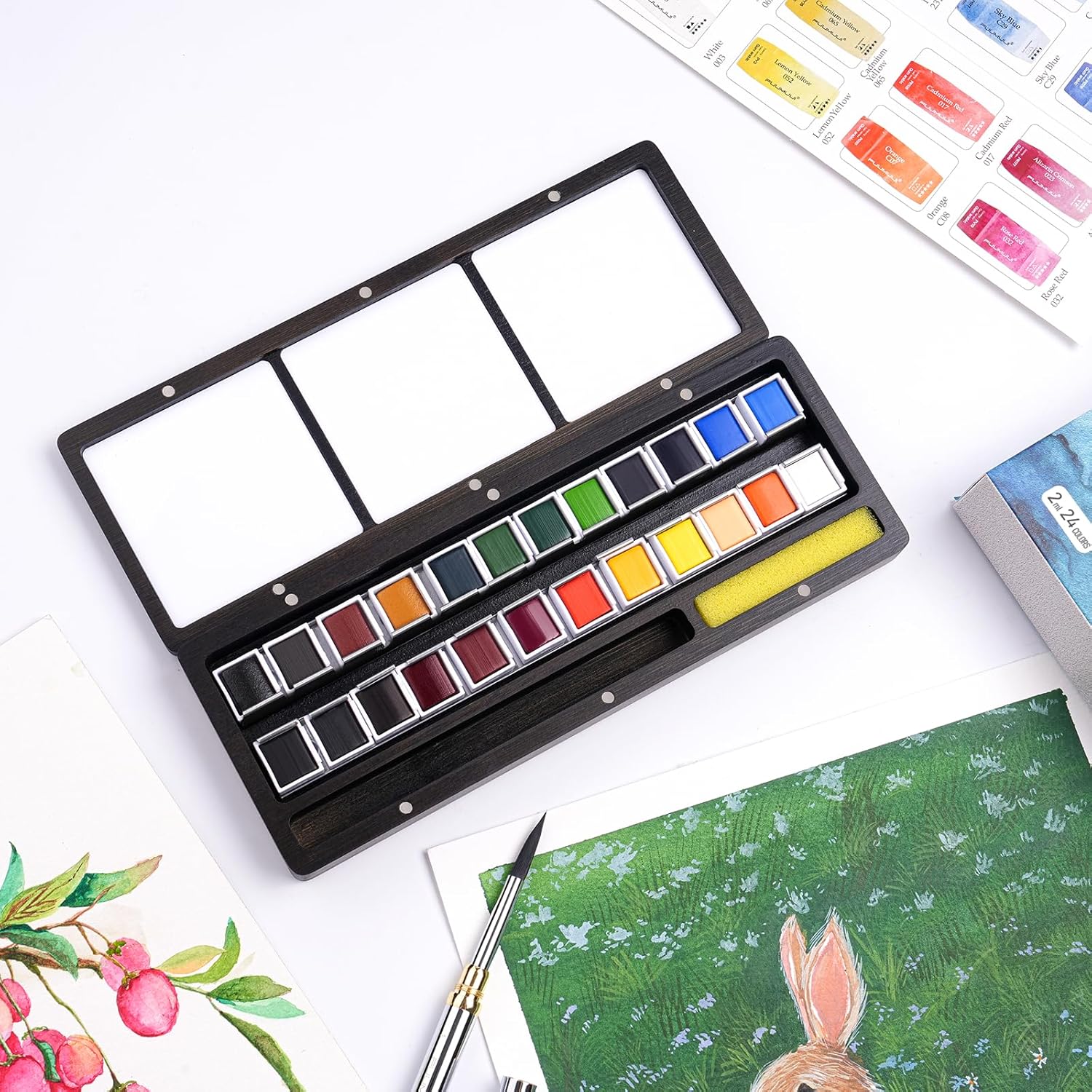 Fuumuui 24 Couleurs Peinture Aquarelle avec Pinceaux de Voyage à Double Pointe et Palette en Bois
