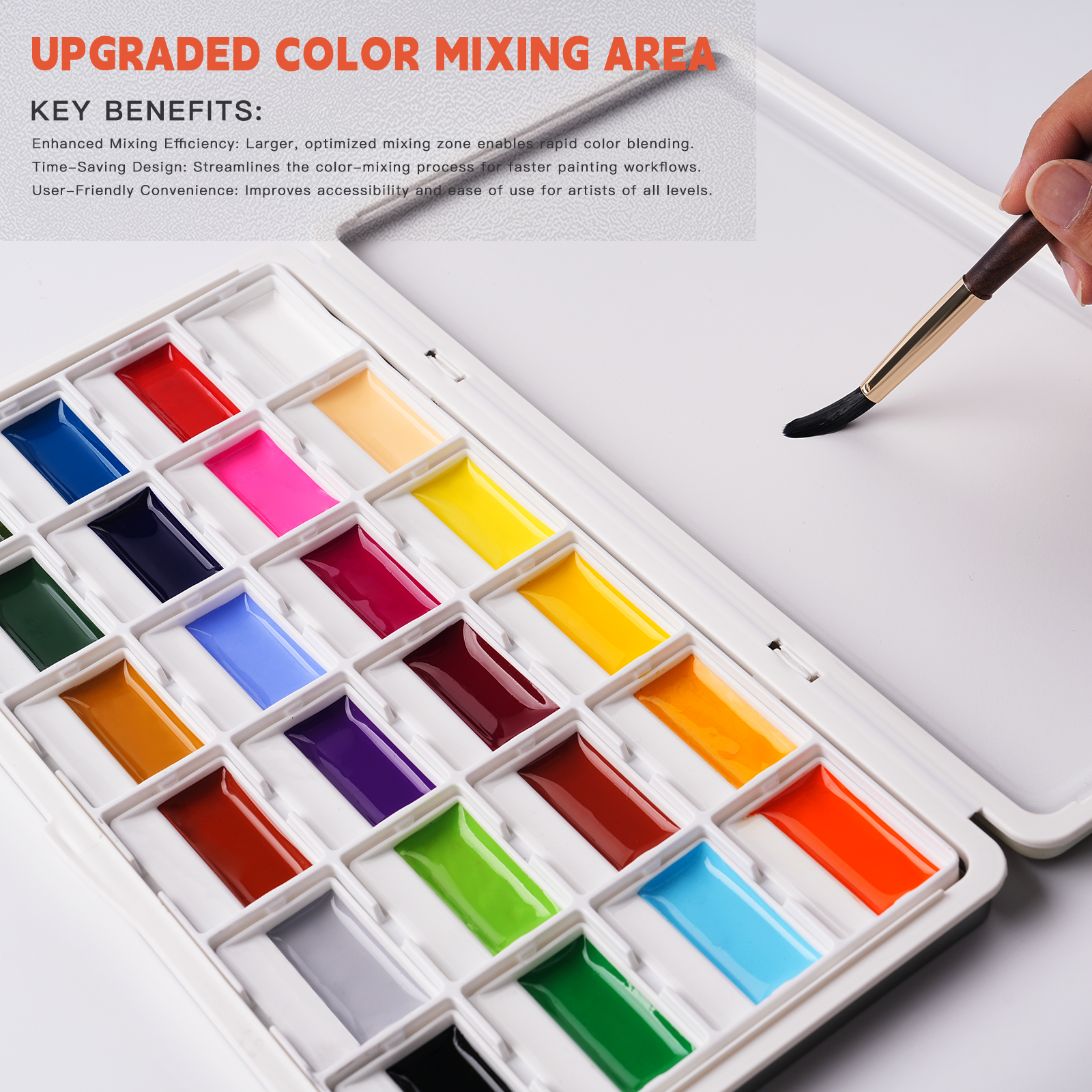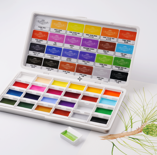 This 24-color bright-tone set of Opaque Semi-Moist Watercolors is crafted for artists who crave vivid, expressive color with bold saturation and smooth control. Featuring a carefully curated range of rich, luminous hues—including Light Hansa Yellow, Indian Red, Prussian Blue, Cobalt Violet, Olive Green, and Lamp Black—this set delivers stunning vibrancy and full-bodied pigment in every pan.