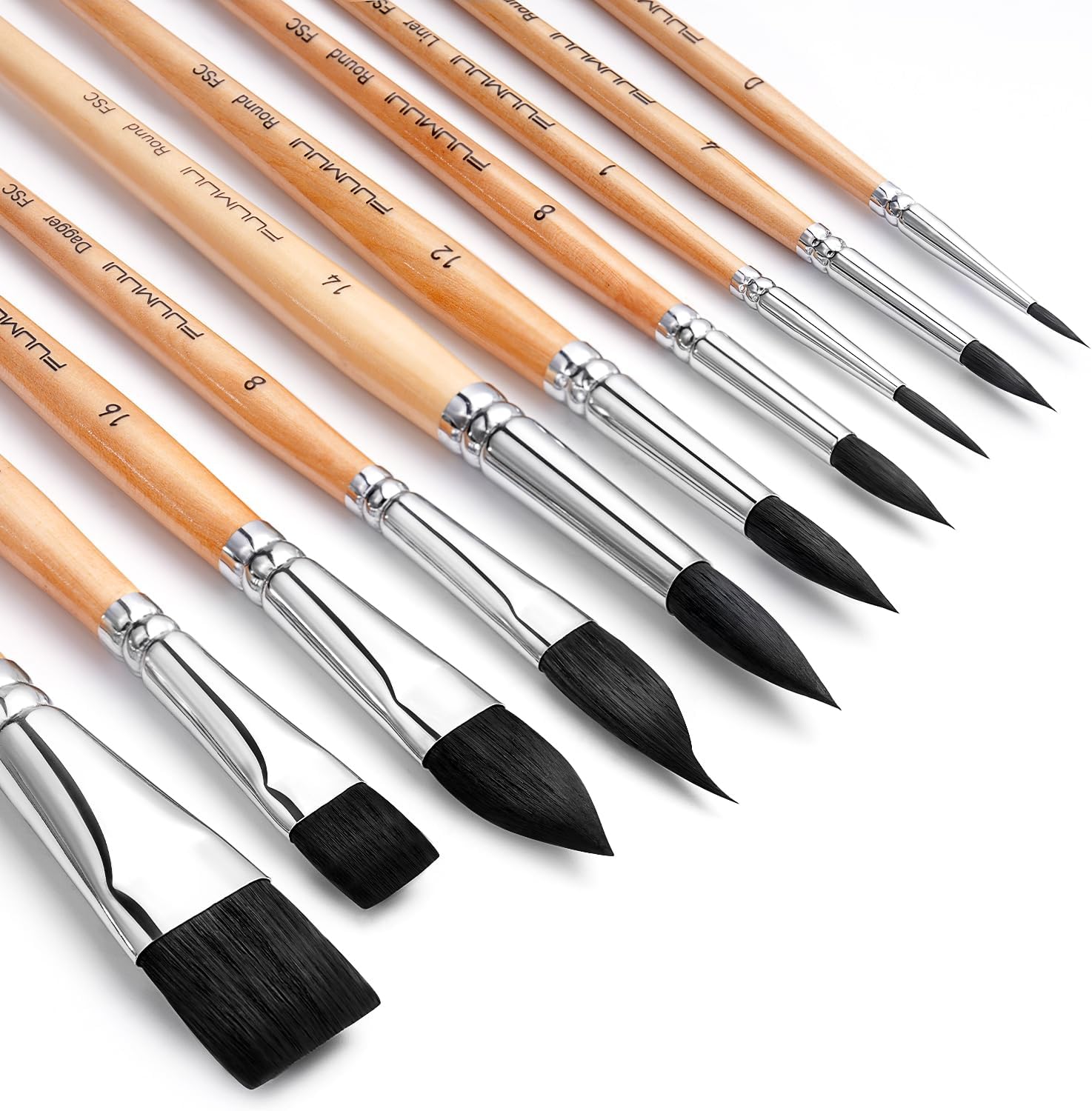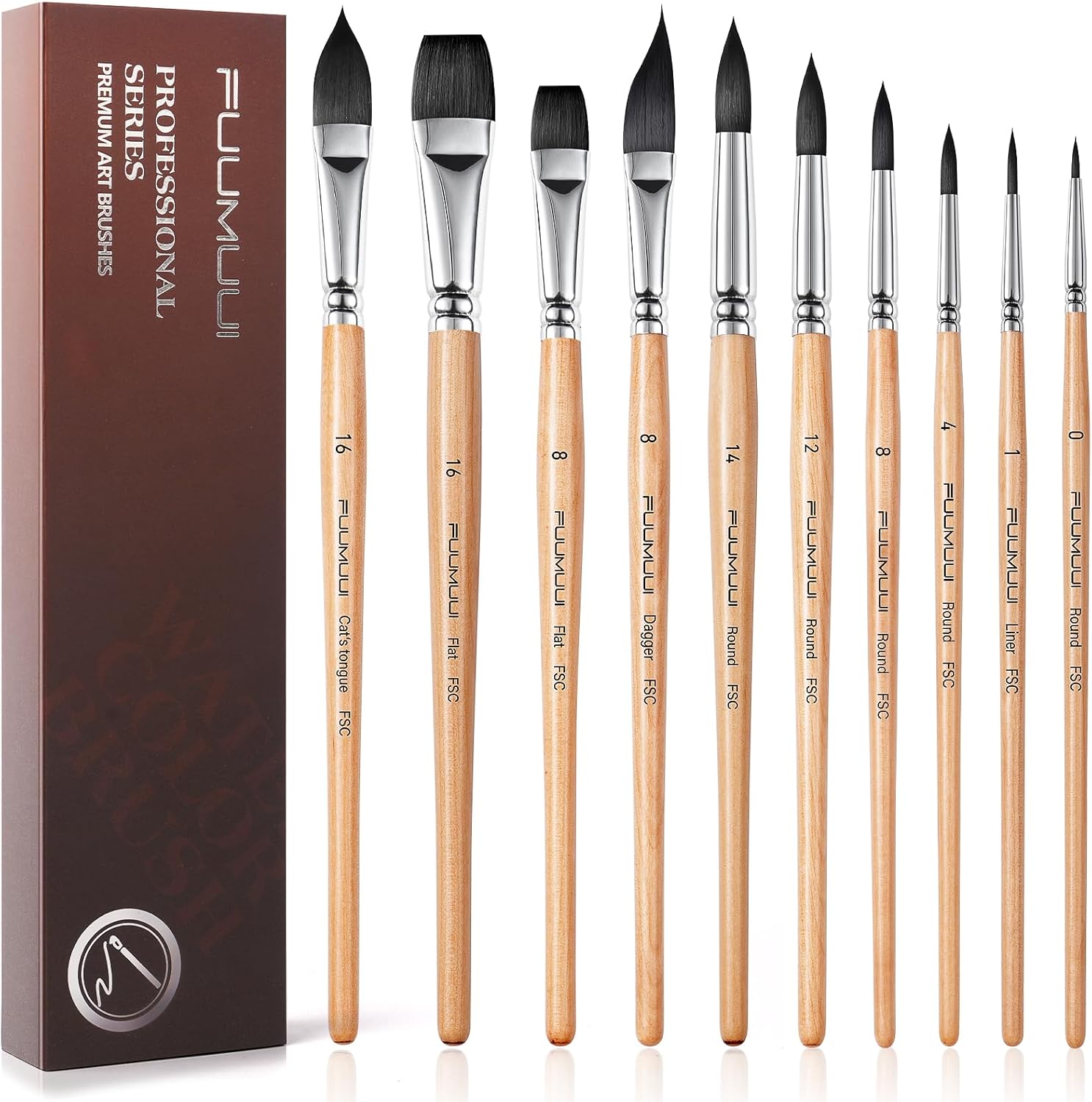 Fuumuui 10pcs Professional Synthetic Squirrel Paint Brushes for Artists - Flat, Round Pointed, Dagger, Cats Tongue Oval Wash
