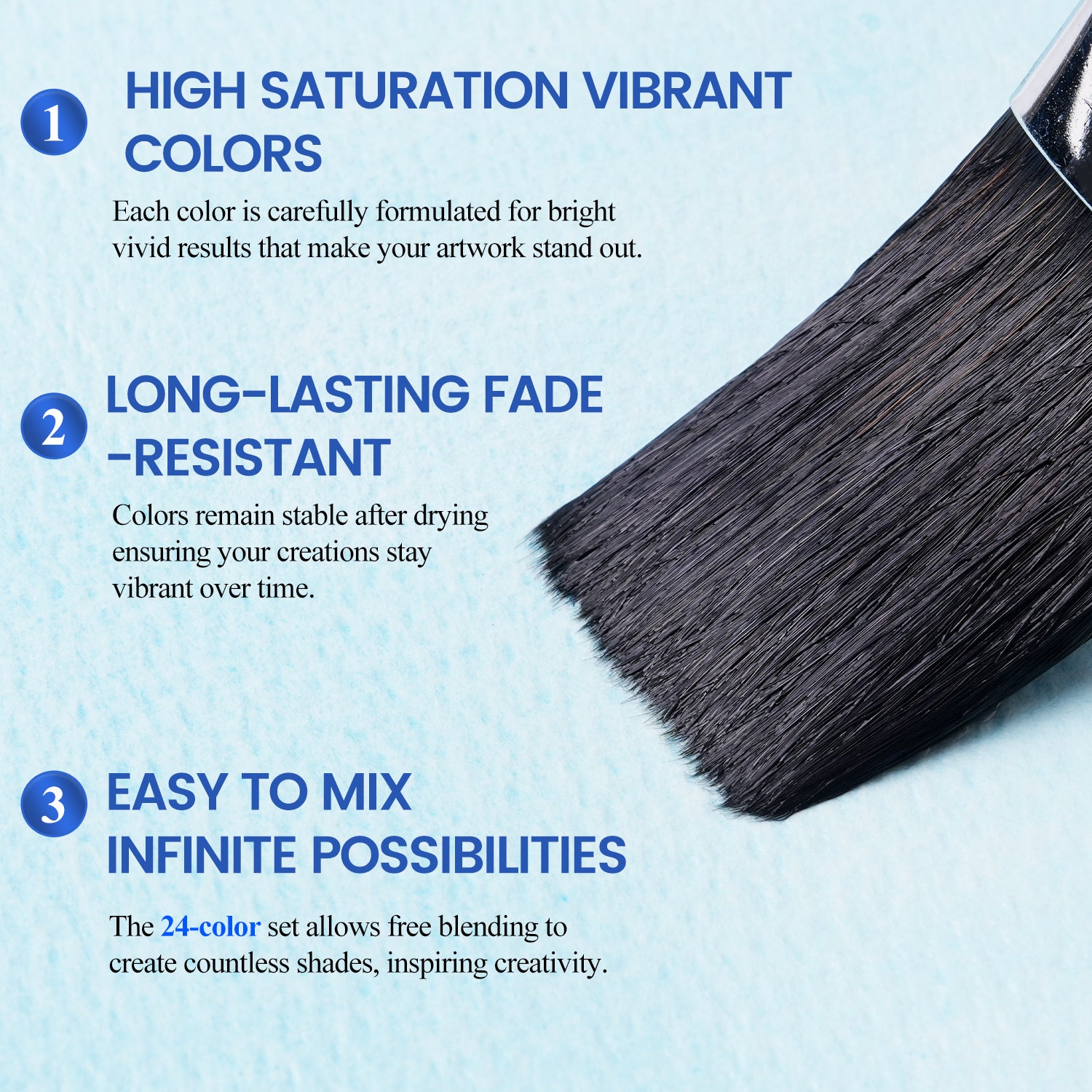 The 24-color palette can be used individually or combined to create infinite color variations, making it ideal for professional painting, illustration, landscape studies, and various craft applications. Whether achieving fine light-and-shadow effects or covering large areas with solid color, this set provides consistent, reliable performance.