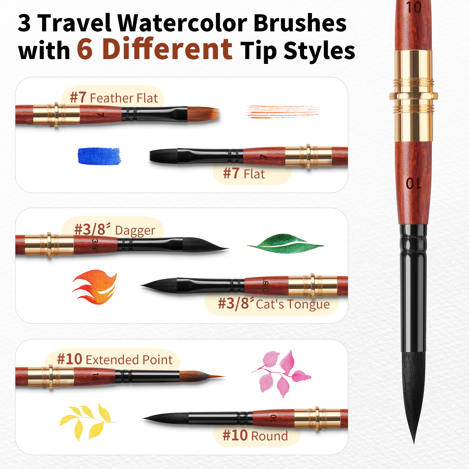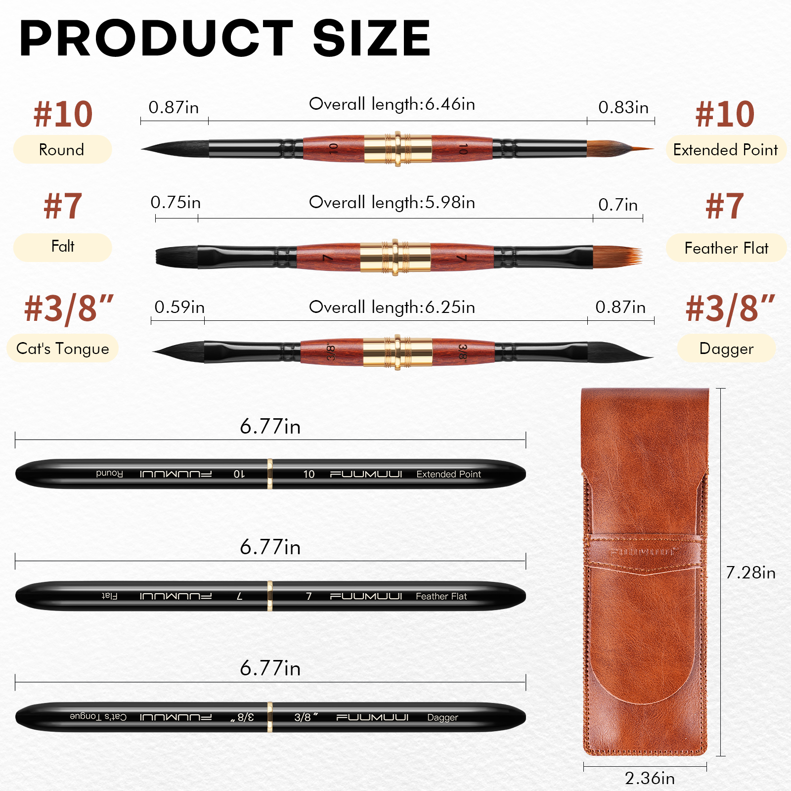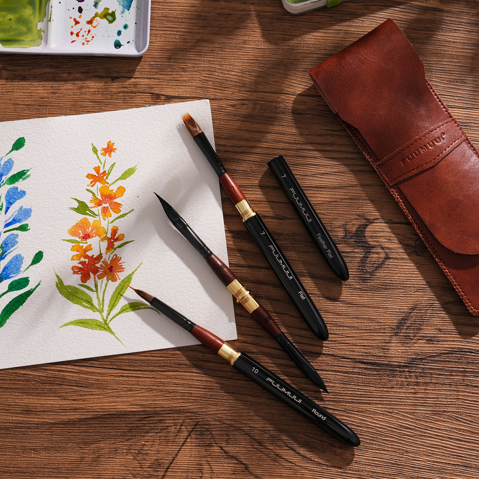 Fuumuui 3pcs Dual-Tip Synthetic Travel Watercolor Brush Set with Leather Pouch – 6 Shapes for Watercolor & Gouache