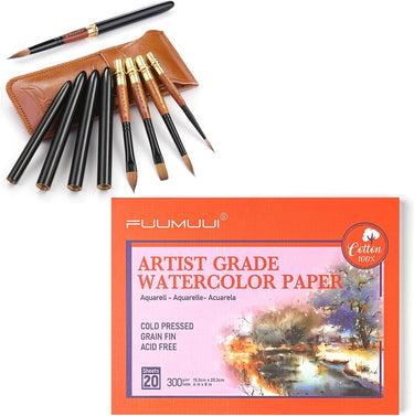 Fuumuui 4pcs Sable Travel Watercolor Brushes with 20 Sheets 5.8" x 8.3" Watercolor Paper Pad