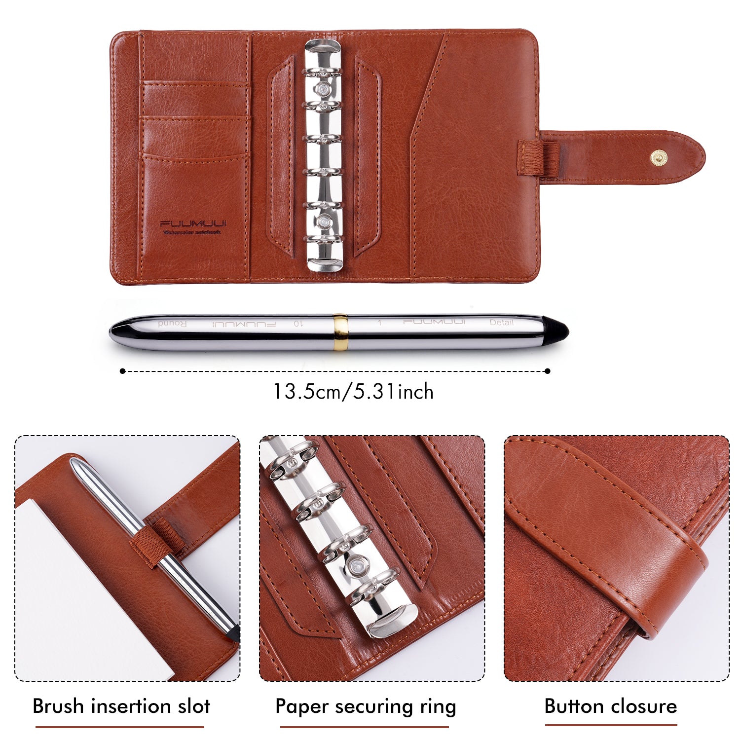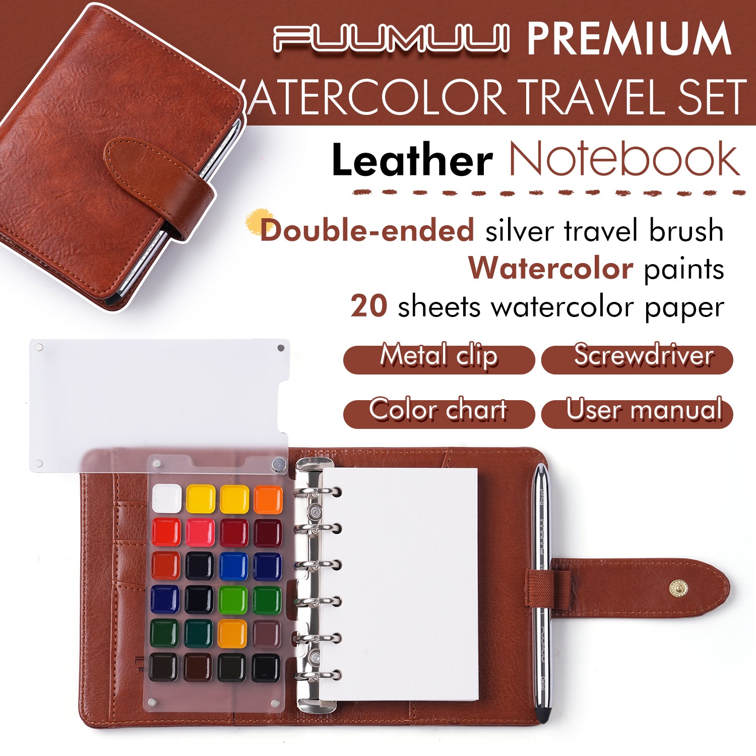 Fuumuui Watercolor Travel Set – PU Leather Cover, 300gsm Cotton Paper, Double-Ended Travel Brush with Carbon Lead, Premium Watercolor Paints, Refillable Ring-Bound Design (Large/Medium/Small)