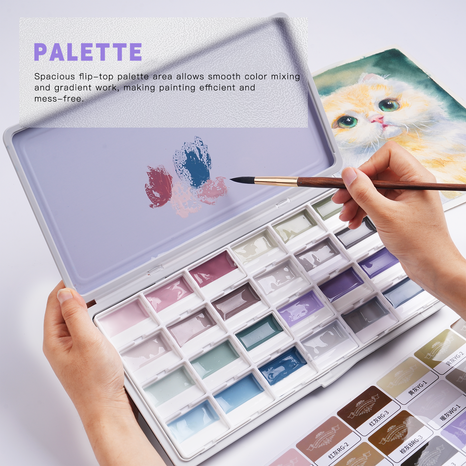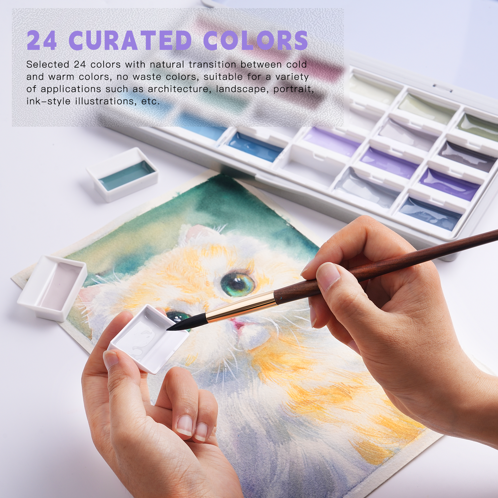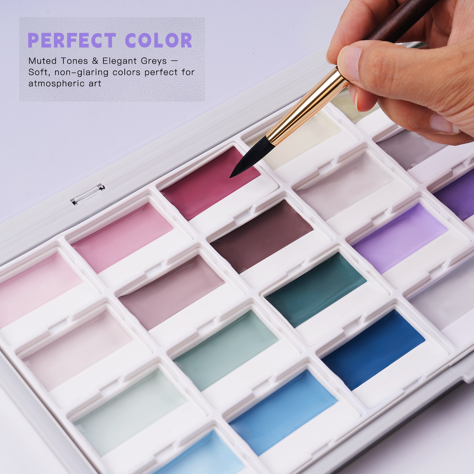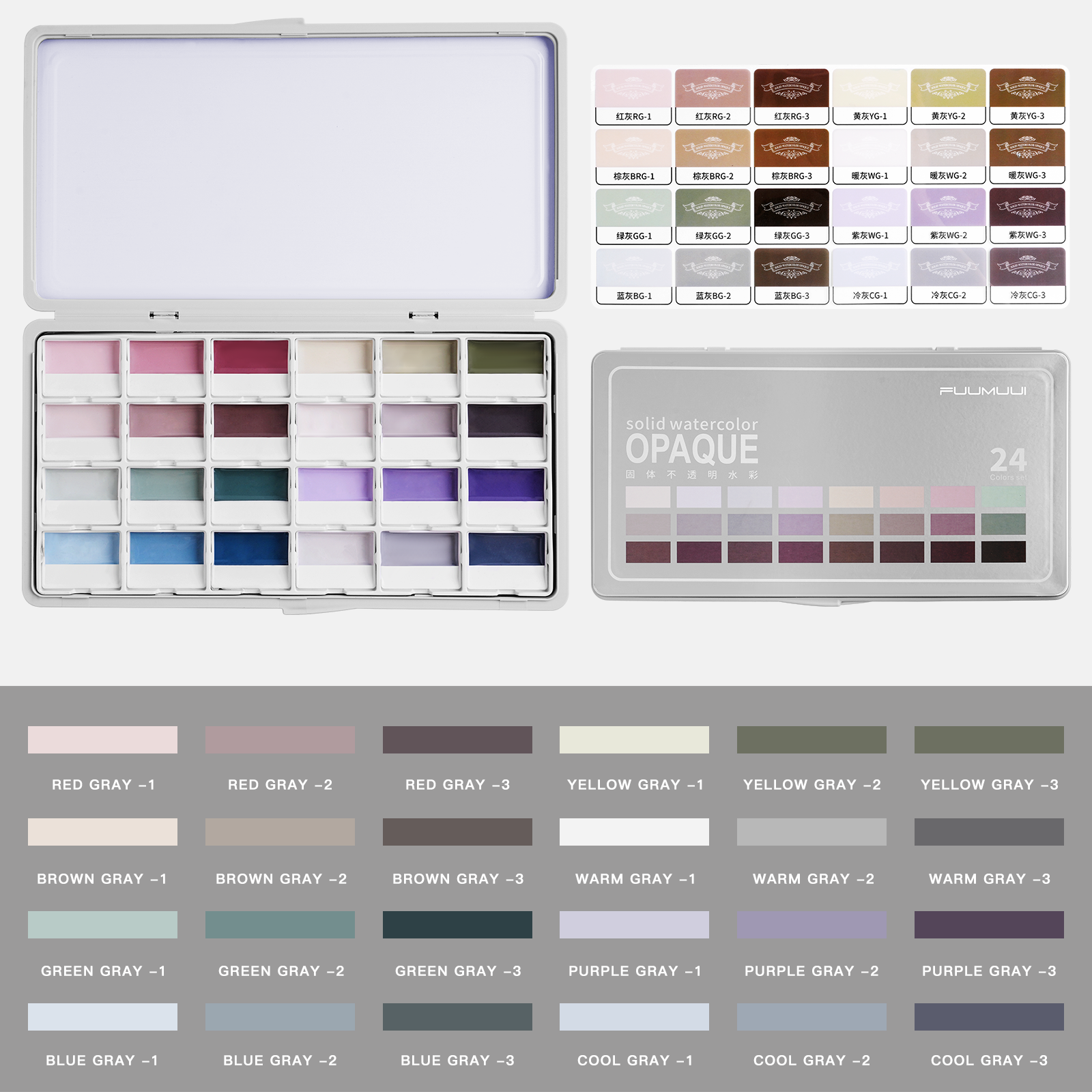 This 24-color set of Opaque Semi-Moist Watercolors is designed for artists who demand precision, depth, and subtle control in every stroke. Featuring a rich gray-toned palette—including red-gray, yellow-gray, brown-gray, and other muted, atmospheric shades—this set is ideal for expressive illustrations, moody landscapes, and tonal studies.
