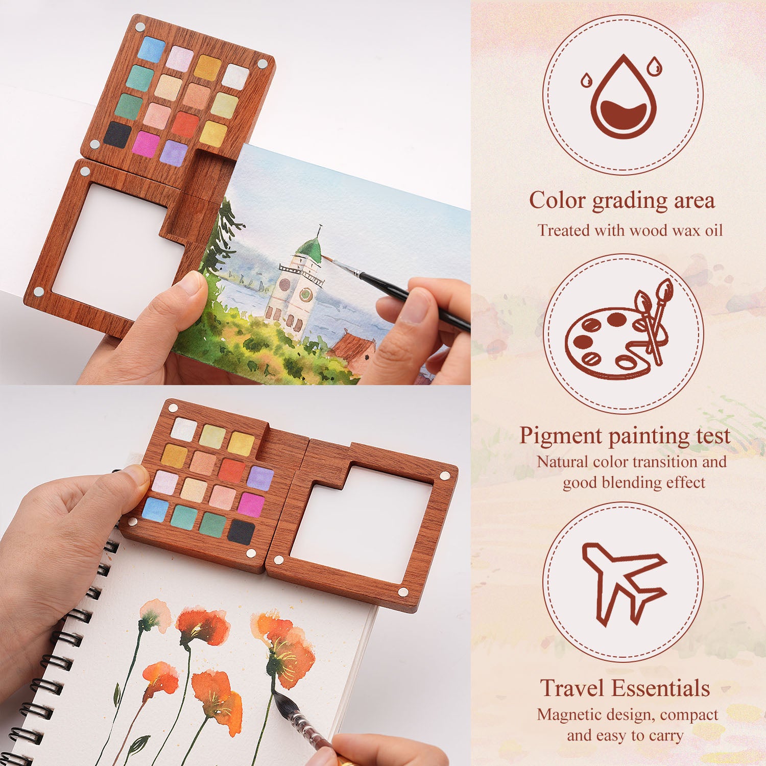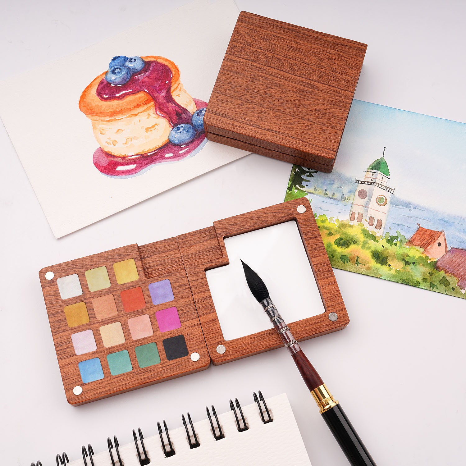 Let your creativity shimmer with this elegant set of 15 pearlescent watercolors, thoughtfully crafted for artists who want to paint with both brilliance and care. Each pan is hand-poured using high-quality, eco-friendly pigments, offering a luminous, iridescent finish that sparkles gently in the light—without compromising on safety or sustainability. These watercolors activate easily with water, flow smoothly on the page, and blend effortlessly, making them ideal for beginners and professionals alike. Whether you're adding delicate highlights to botanical art, enhancing calligraphy, or exploring fantasy illustrations, the colors perform beautifully on all types of watercolor paper, including cotton, cellulose, and textured surfaces. The refined magnetic wooden case provides an artisanal touch while offering secure portability, complete with a built-in mixing tray for effortless blending wherever you paint. Compact, sustainable, and beginner-friendly, this set brings shimmering magic to your everyday art practice—at home, in the studio, or under the open sky.