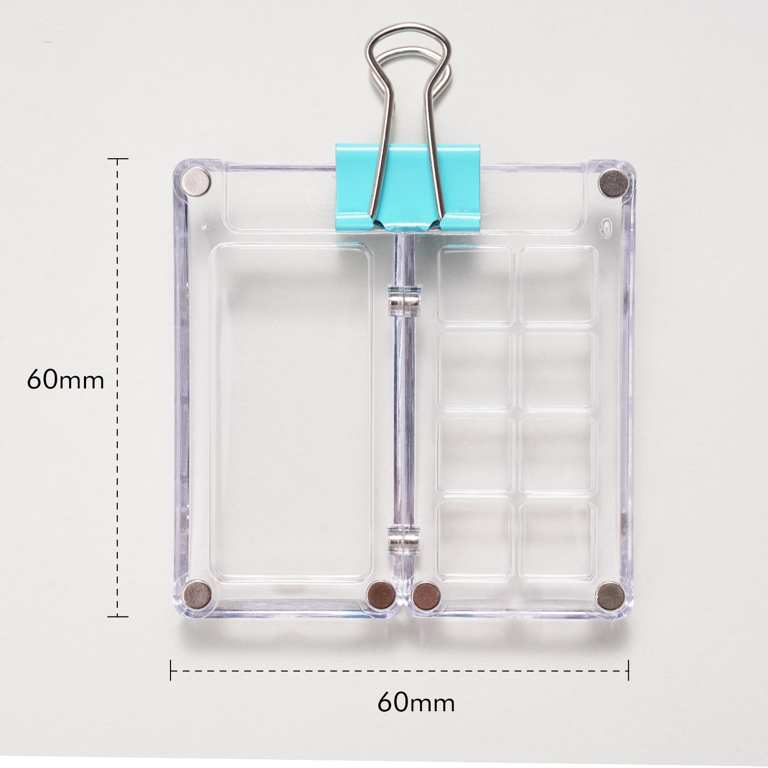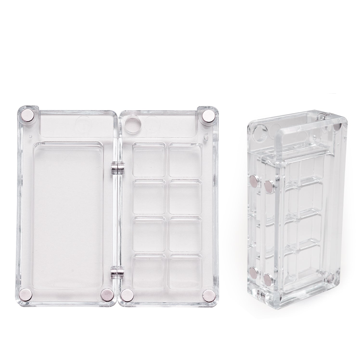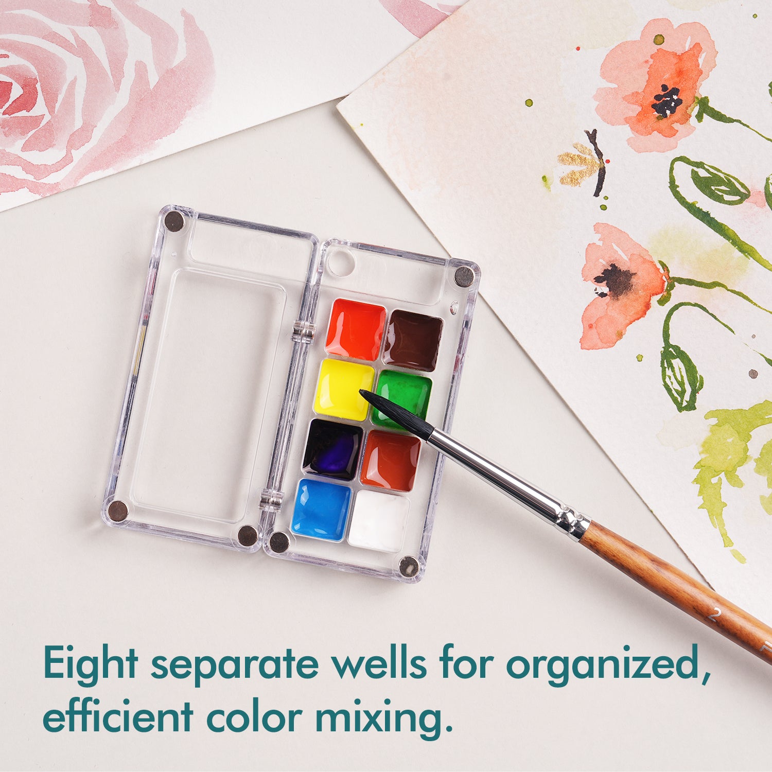Despite its small size, this palette offers a surprisingly functional layout. The left side includes 8 deep wells where you can store your favorite watercolor, gouache, or ink colors. These wells are spaced to help keep colors separate and clean, allowing for easy access and efficient painting. On the right side, a flat, open mixing area gives you room to experiment with blending and create custom shades. The acrylic surface is ideal for mixing and wipes clean easily, so you can start fresh with every session.