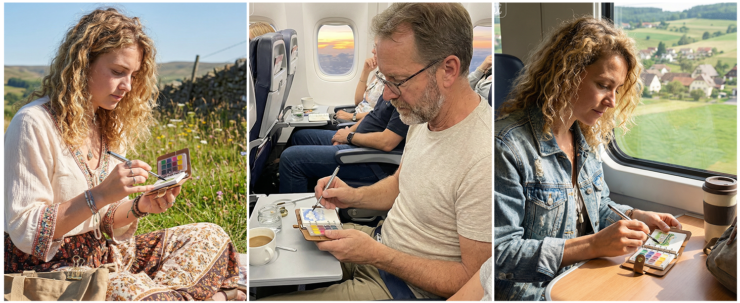 Conjunto de viagem para aguarela Fuumuui – Pincel de viagem de ponta dupla, tintas e 100 folhas de papel de algodão com capa de couro PU (pequeno)