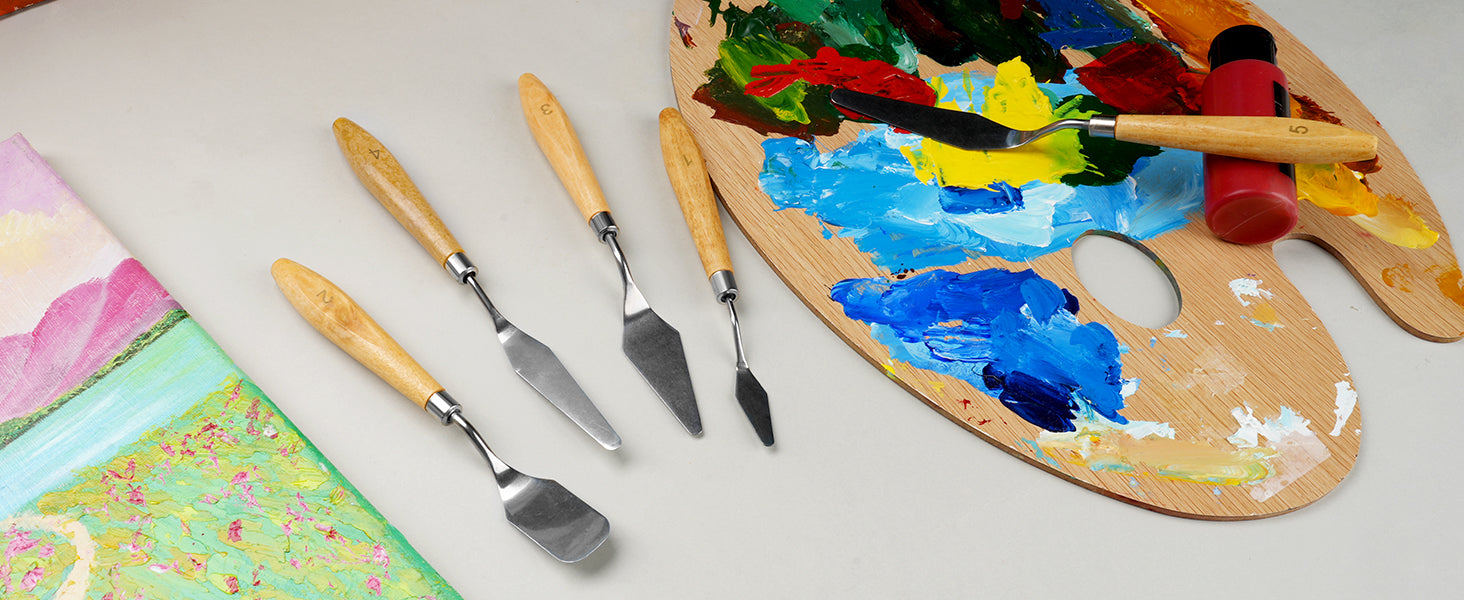 Conjunto de 5 Espátulas para Pintura em Aço Inoxidável para Pintura a Óleo, Tela e Acrílico | Espátula para Pintura | Cabo de Madeira